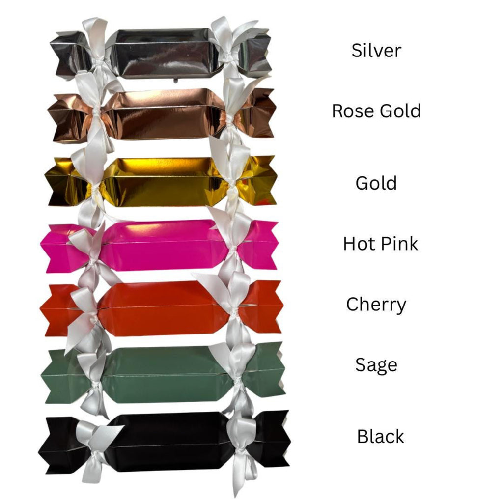 Cracker Colours: black , sage , hot pink , gold , rose gold , silver , cherry ( it’s not a real red colour but more like a burnt red ).